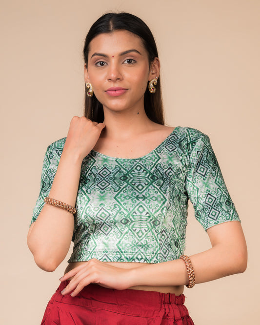 Arkha Rama Green Velvet Geometric Printed Saree Blouse – Round Neck Stretch Fit
