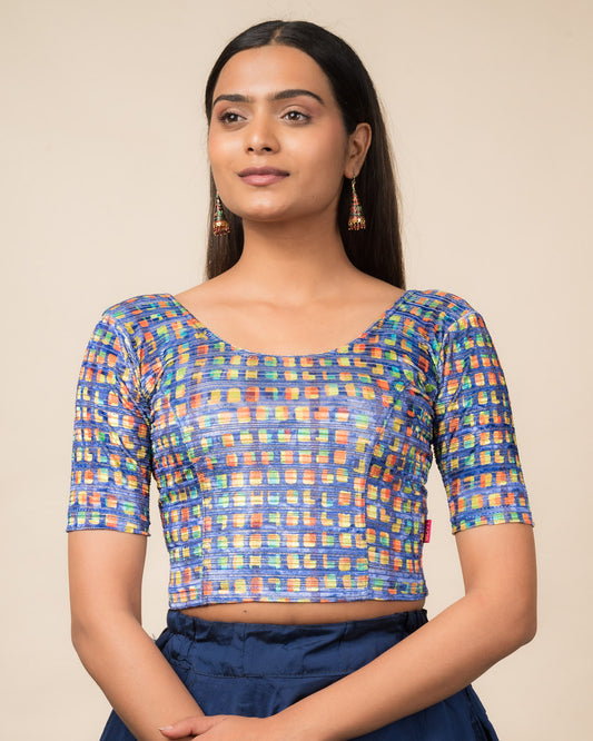 Dunki Velvet Blue Modern Printed Saree Blouse | Stretchable Readymade Blouse