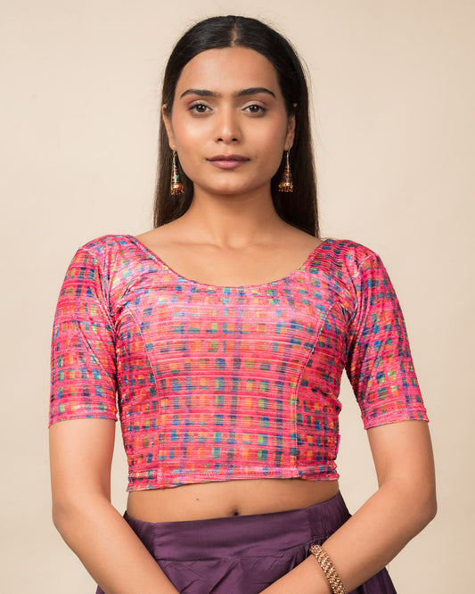 Arkha Pink Velvet Geometric Printed Saree Blouse – Stretchable Ready-to-Wear Elbow Sleeve