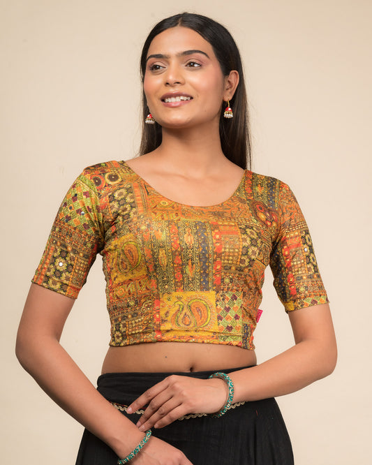 Aaina Jacquard Mustard Blouse with Kutch Print Mirror Work Stretchable Fit | Fusion Wear