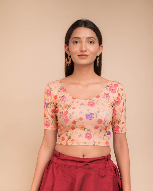 Sahiba Digital Print Peach Floral Stretchable Slip On Blouse
