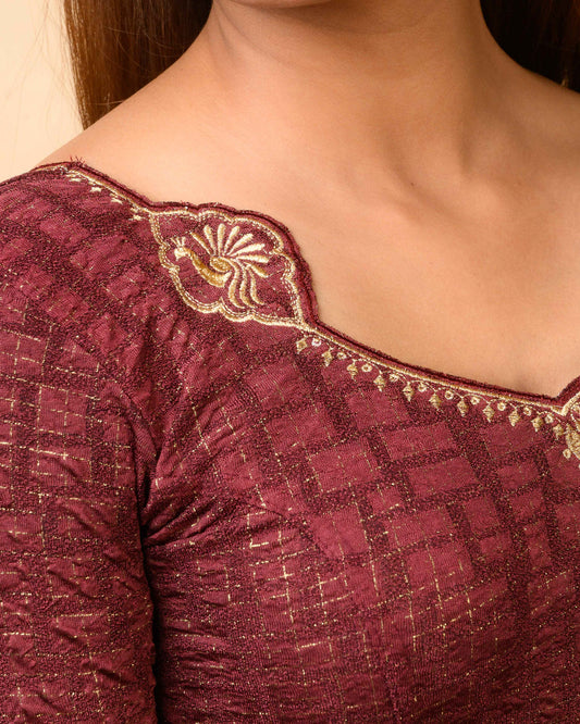 Morpankh Wine Zari Embroidered Designer Neck Saree Blouse Advi