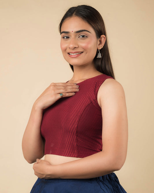 Jyoti Maroon Cotton Jacquard Sleeveless Stretchable Saree Blouse by Advi