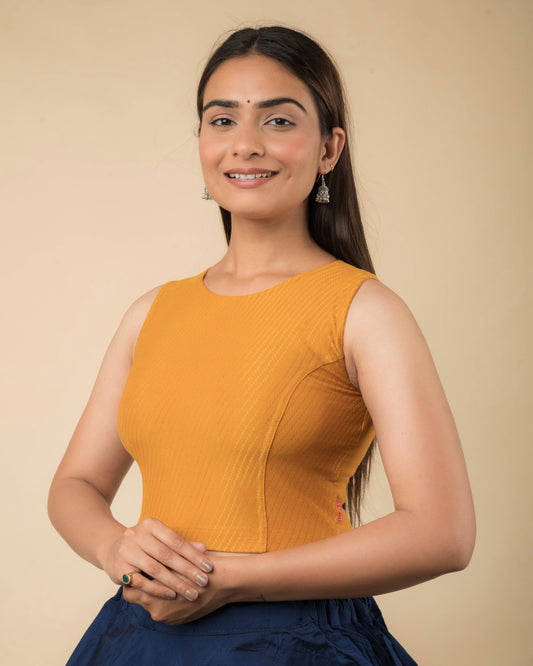 Jyoti Mustard Cotton Jacquard Sleeveless Self Design Saree Blouse by Advi