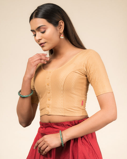 Bebo Beige Gold Zari Saree Blouse – V Neck Stretchable Ready to Wear Blouse