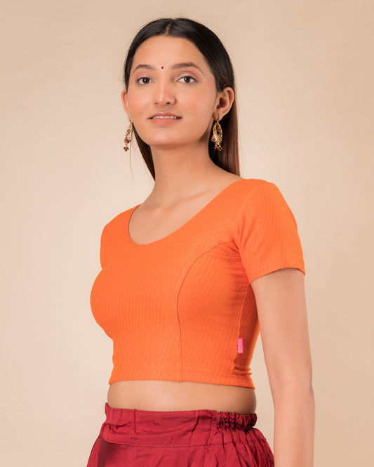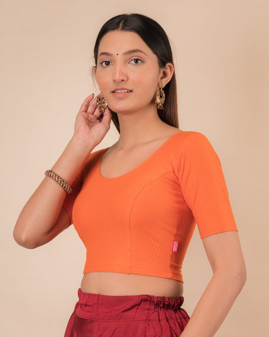 Gauri Orange Puff Sleeve Blouse with Gold Glitter Stretchable Melange Advi