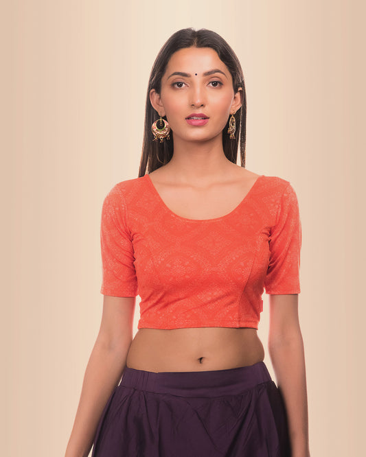 Aaina Jacquard Orange Blouse with Kutch Print Mirror Work Stretchable Fit | Festivewear
