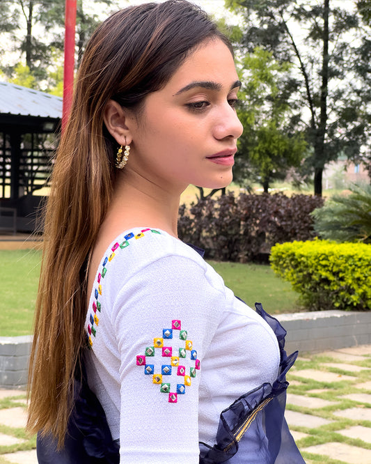 Siddhi Multicolour Mirror Work White Saree Blouse | Festive Readymade Fit