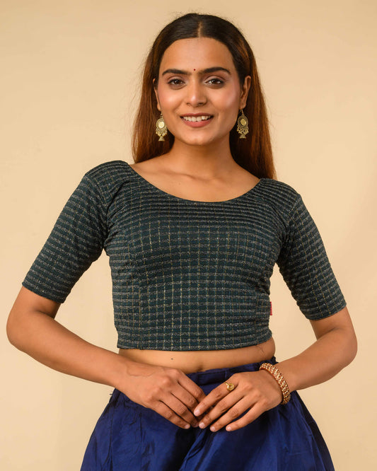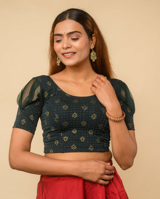 Paavna Bottle Green Organza Puff Sleeve Stretchable Saree Blouse Advi