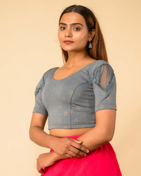 Paavna Gray Jacquard Organza Sleeve Stretchable Saree Blouse Advi