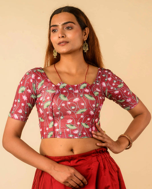 Pushkar Maroon Multicolour Pichwai Lotus Jacquard Stretchable Saree Blouse Advi