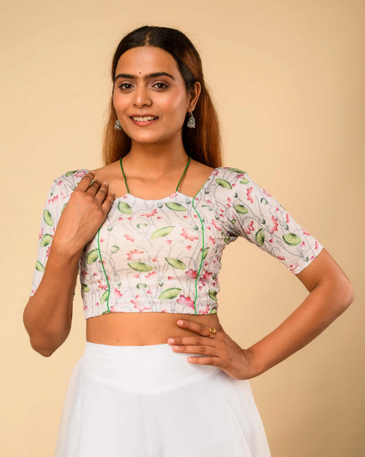 Pushkar White Multicolour Pichwai Lotus Jacquard Stretchable Saree Blouse Advi