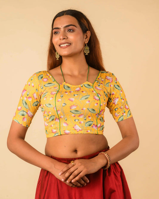 Pushkar Yellow Multicolour Pichwai Lotus Jacquard Stretchable Saree Blouse Advi