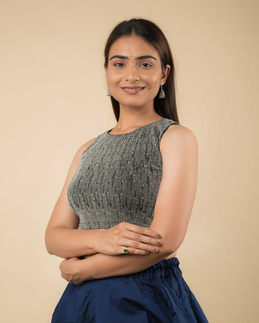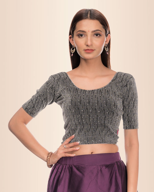 Kimaya Steel Grey Metallic Net Design Saree Blouse – Glam Saree Look, Stretch Fit
