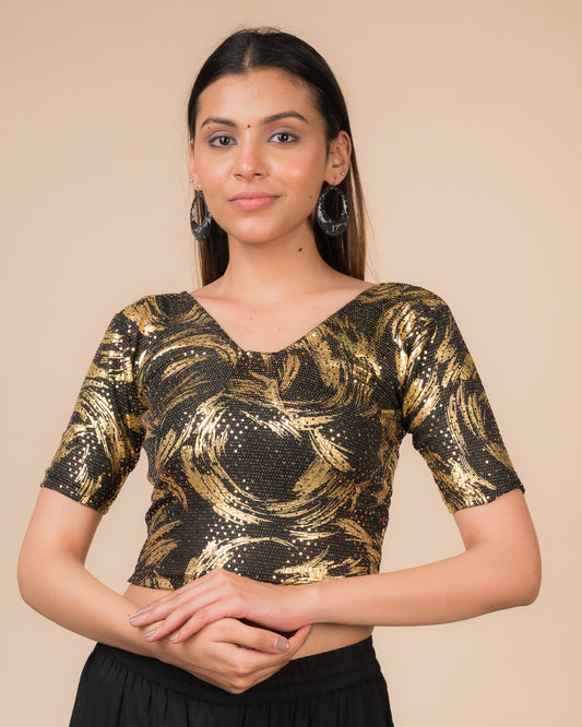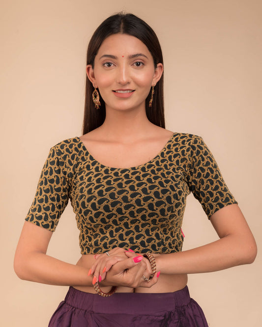 Rashi Gold Black Square Neck Stretchable Slip On Blouse – Elbow Sleeves, Ready-to-Wear