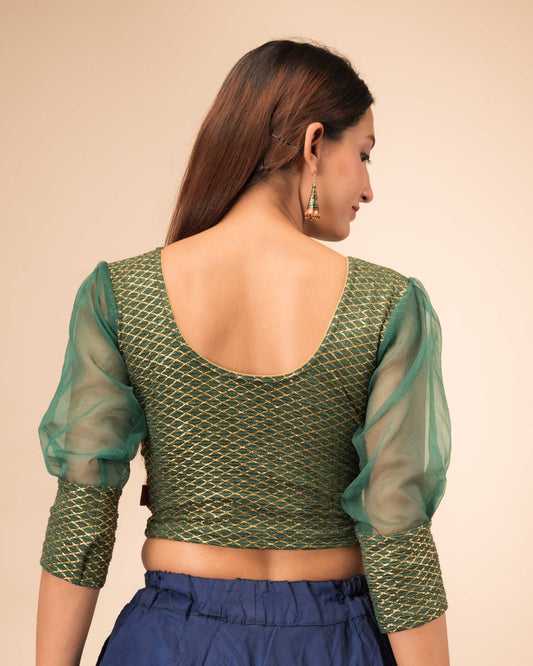 Simi Bottle Green Organza Blouse with Long Balloon Sleeves and Gold Checks by Advi