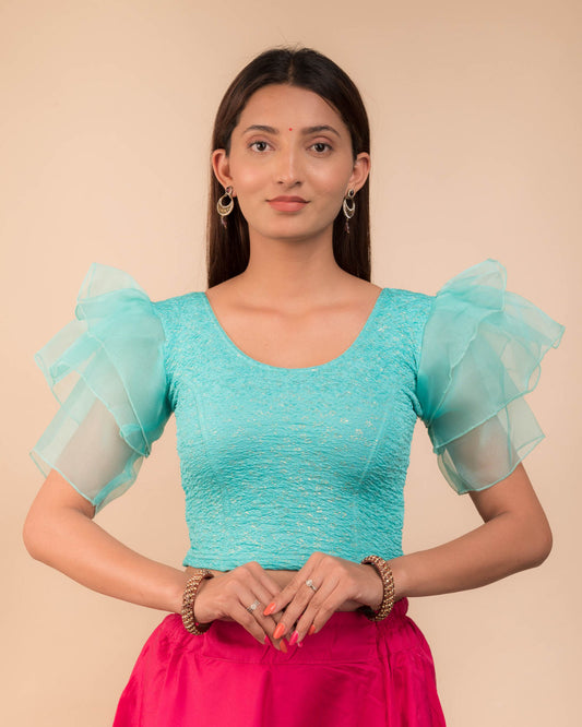 Aneeth Green Velvet Readymade Blouse with Organza Bell Sleeves | Silk Saree Perfect