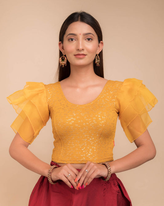 Koel Mustard Jacquard Blouse with Gold Flower Organza Ruffle Sleeves by Advi