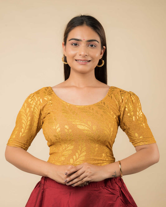 Surkh Mustard Emboss Metallic Saree Blouse | Stretchable Traditional Blouse
