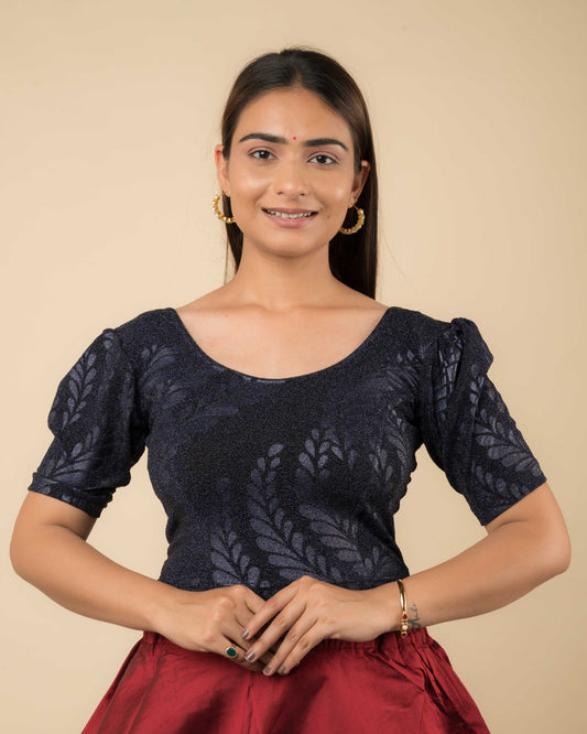 Surkh Navy Metallic Emboss Blouse with Puff Sleeves | Stretchable Partywear Choli