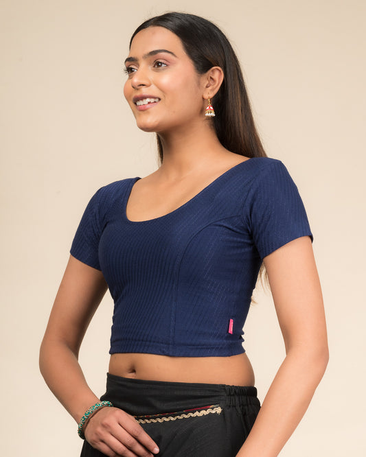 Dobby Navy Cotton Jacquard Half Sleeve Slip On Blouse by Advi