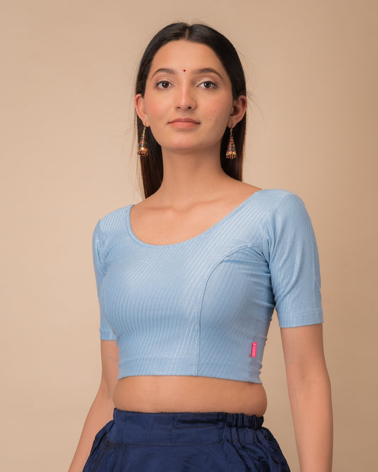 Dobby Powder Blue Cotton Elbow Sleeve Stretchable Blouse by Advi