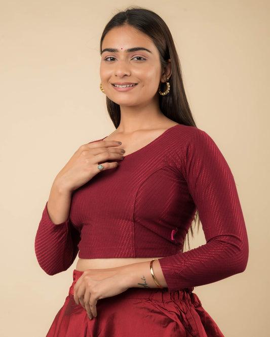 Dobby Maroon Cotton Long Sleeve Slip On Jacquard Saree Blouse by Advi