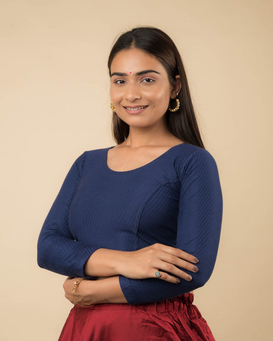 Dobby Navy Cotton Long Sleeve Slip On Stretchable Saree Blouse by Advi