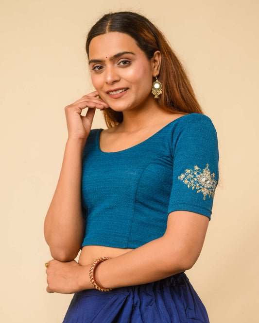 Vajra Navy Blue Bajuband Embroidery Work Stretchable Saree Blouse