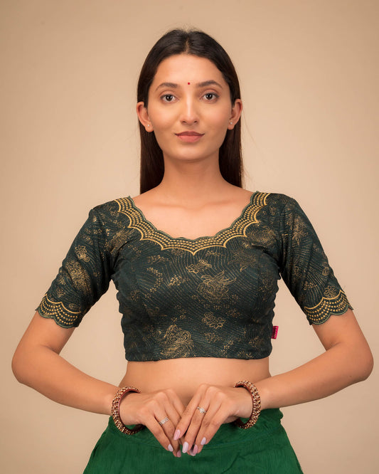 Suraj Gold Zari Stone Neckline Bottle Green Scallop Sleeve Stretchable Saree Blouse