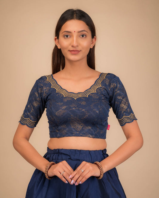 Suraj Gold Zari Stone Work Navy Scallop Sleeve Saree Blouse | Stretchable