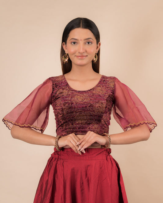 Aneeth Maroon Zari Velvet Readymade Blouse with Organza Sleeves | For Banarasi Silk Sarees