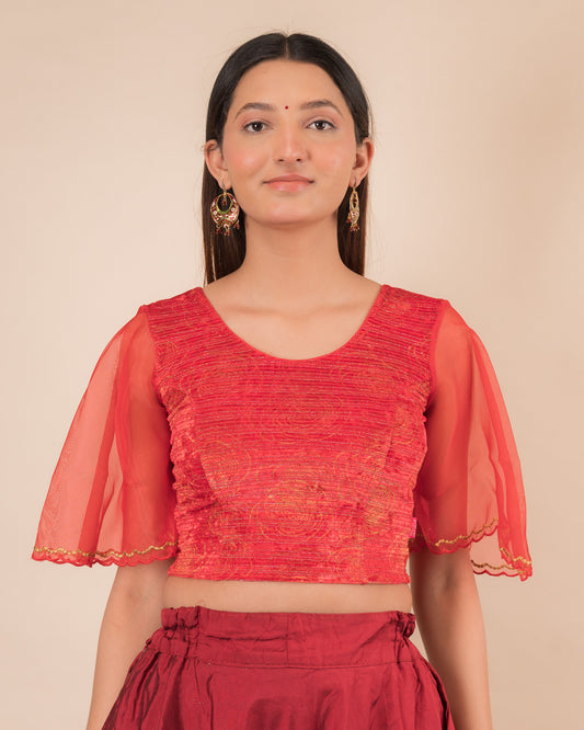 Aneeth Red Rose Velvet Blouse with Organza Sleeves | Stretchable Wedding Wear