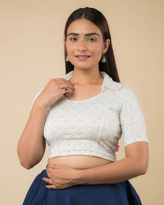 Kalki Silver Jacquard Blouse Hand Embroidered Collar – Stretchable Readymade Fit