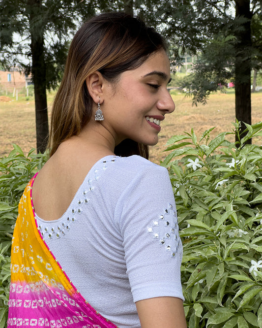 Durga Mirror Work White Saree Blouse with Embroidered Neckline Stretchable Fit