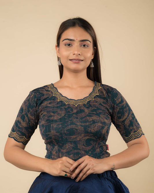 Ravina Navy Scallop Cut Work Neckline Metallic Stretchable Slip On Blouse