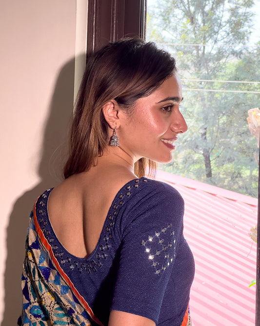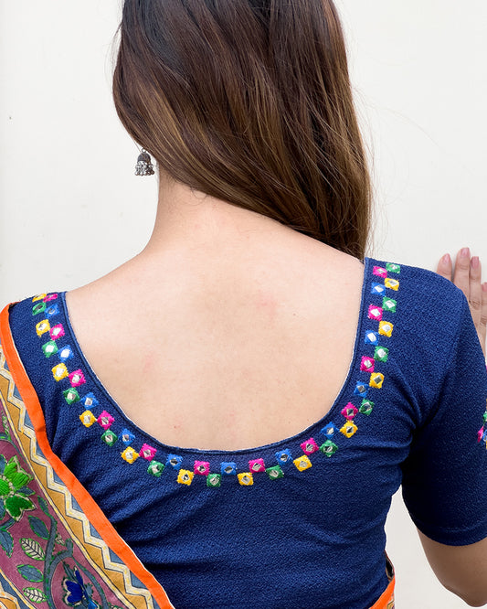 Durga Mirror Work Navy Saree Blouse for Navratri with Embroidery Stretchable Fit