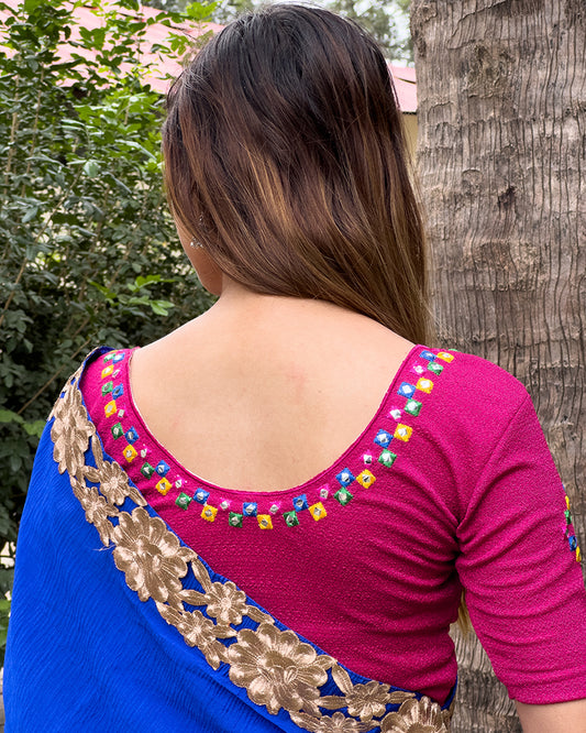 Durga Mirror Work Purple Saree Blouse with Embroidered Neckline Stretchable Fit