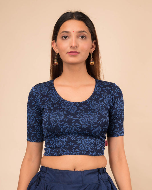 Amira Navy Jacquard Elbow Sleeve Blouse with Peekaboo Back Advi