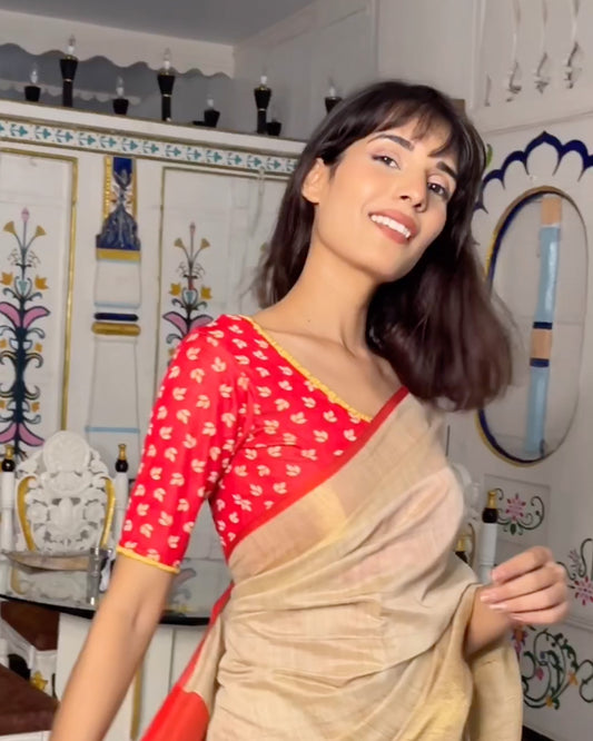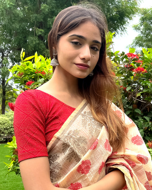 Urvi Red Zari Blouse with Gold Metallic Jacquard and Boat Neck Advi