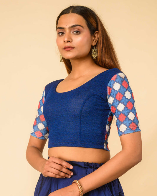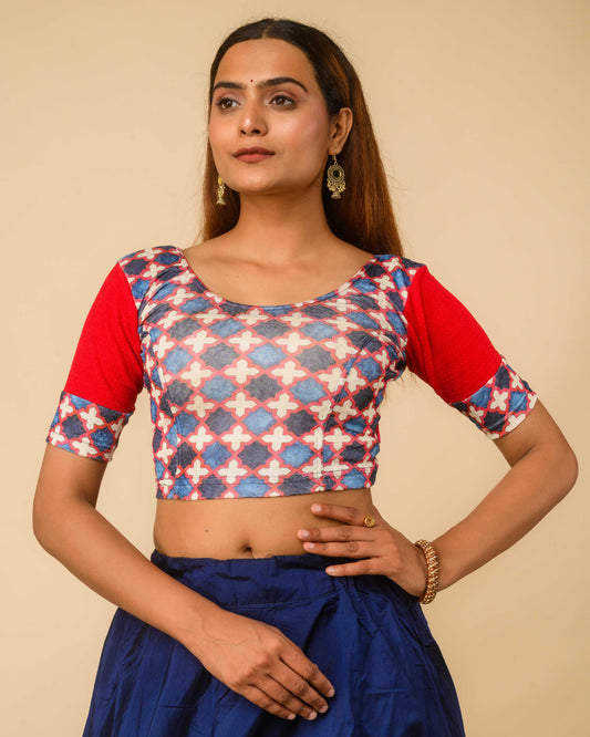 Mohar Red Ajrakh Print & Solid Sleeve Readymade Saree Blouse – Advi