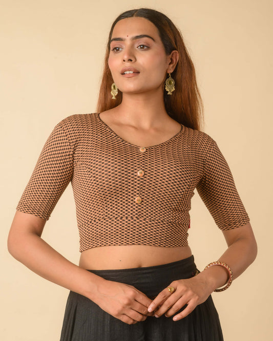 Gingham Black Brown Stretchable Checked V-Neck Saree Blouse Advi