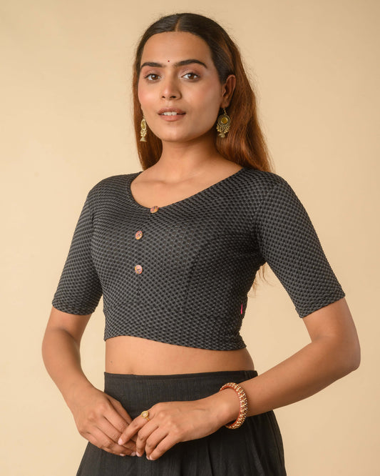 Gingham Black Stretchable Checked V-Neck Saree Blouse Advi