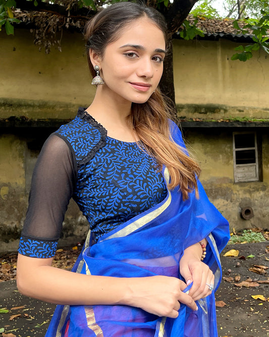 Madhubala Advi Navy Sheer Organza Balloon Sleeve Slip On Stretch Blouse