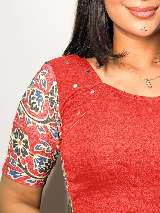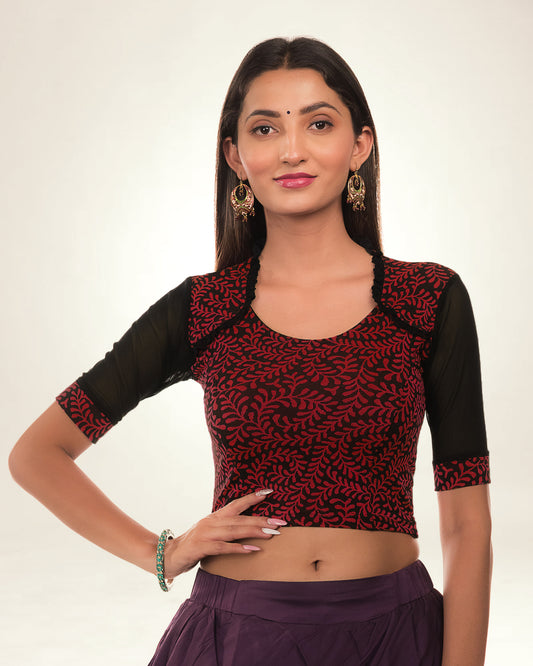 Durga Red Navratri Ajrakh Mirrorwork and Cowri Latkan Stretchable Readymade Blouse