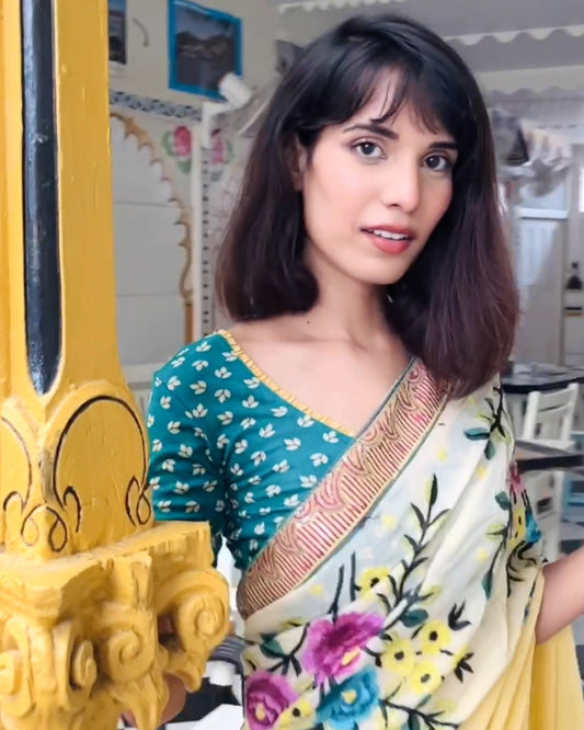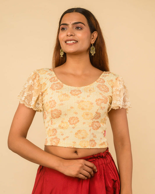 Titli Gold Cream Floral Zari Jacquard Retro Bell Sleeve Stretchable Saree Blouse