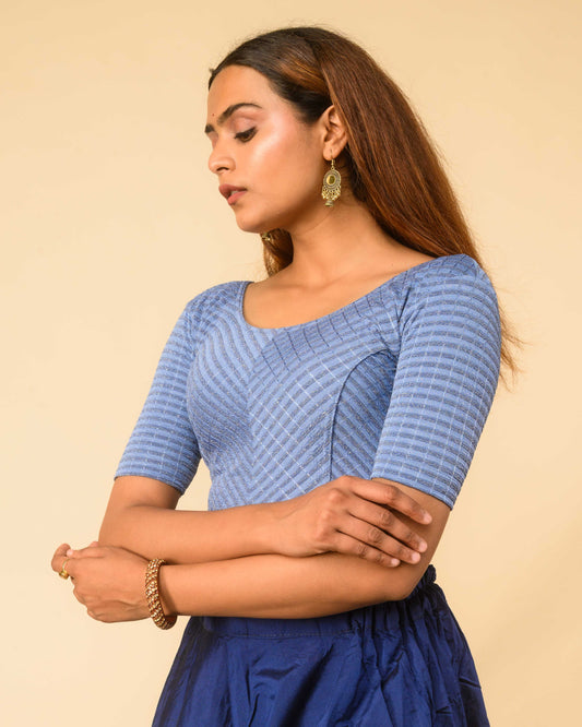 Amba Steel Blue Jacquard Blouse with Zari Stripes and Zig Zag by Advi