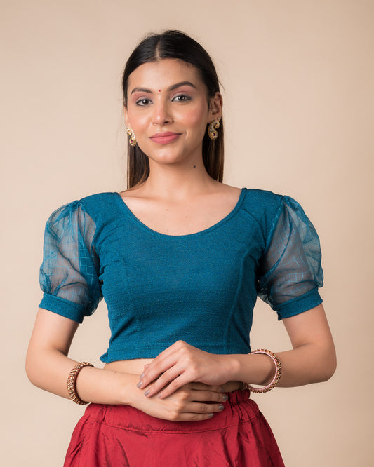 Madhubala Advi Teal Blue Organza Voluminous Sleeve Slip On Party Blouse
