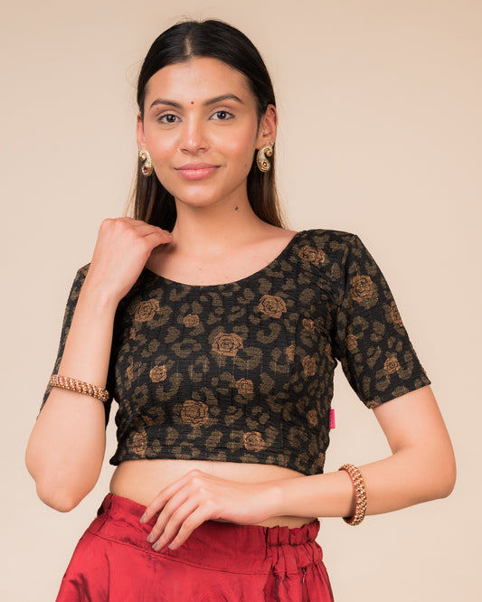 Kubra Black Floral Gold Fancy Metallic Foil Stretchable Slip on Blouse by Advi