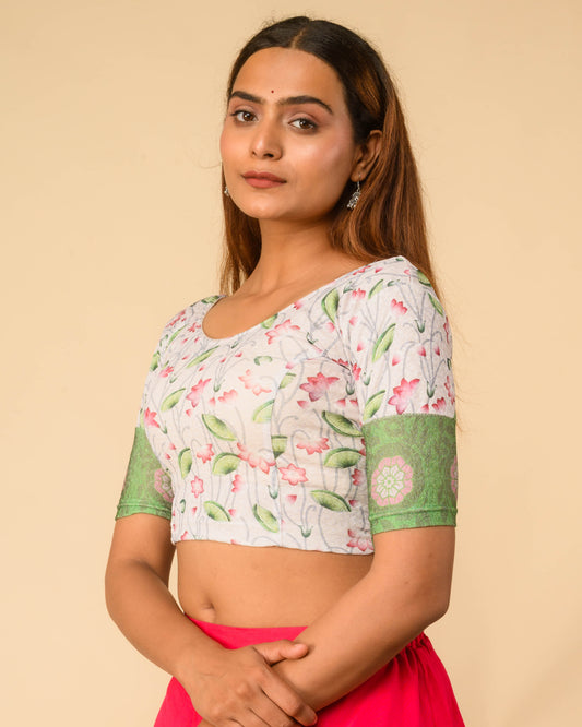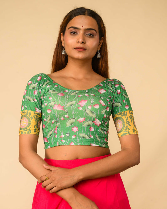 Pushkar Green Multicolour Pichwai Lotus Jacquard Stretchable Saree Blouse Advi